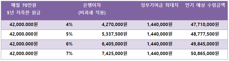 매월 70만 원을 5년 동안 저축하면 원금은 4,200만 원이 됩니다. 은행 금리 6%로 경정되면 비과세 적용받아 이자로 6,405,000원을 받을 수 있고 여기에 정부 기여금 최대치로 1,440,000원을 받을 경우 만기 예상 수령액은 49,845,000원이 됩니다.